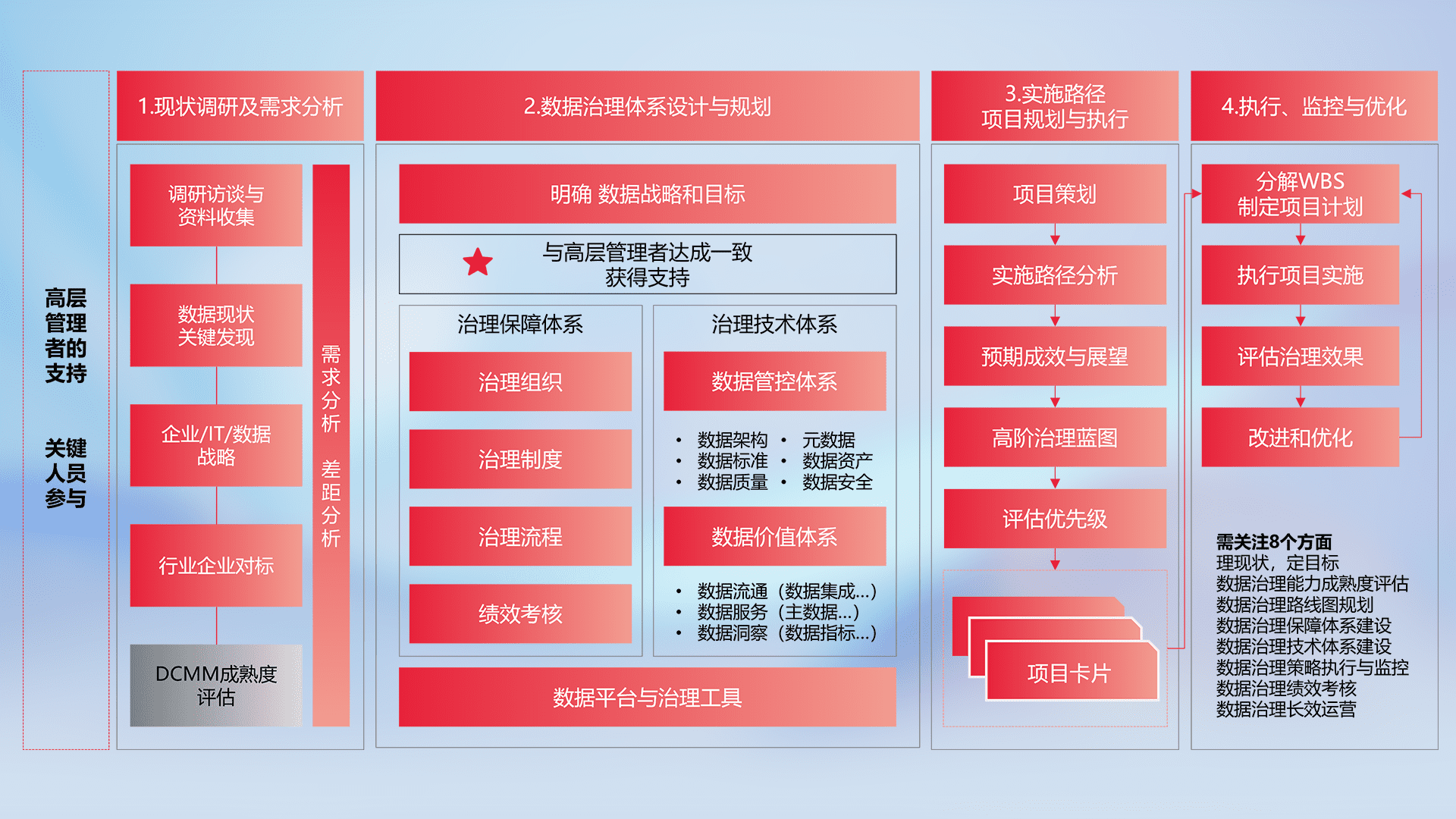 制定并执行统一的数据标准,,,规范数据定义和格式,,,,消除冗余和不一致性,,实现跨部门和跨系统的数据一致性,,,,为企业提供标准化的数据基础。。。