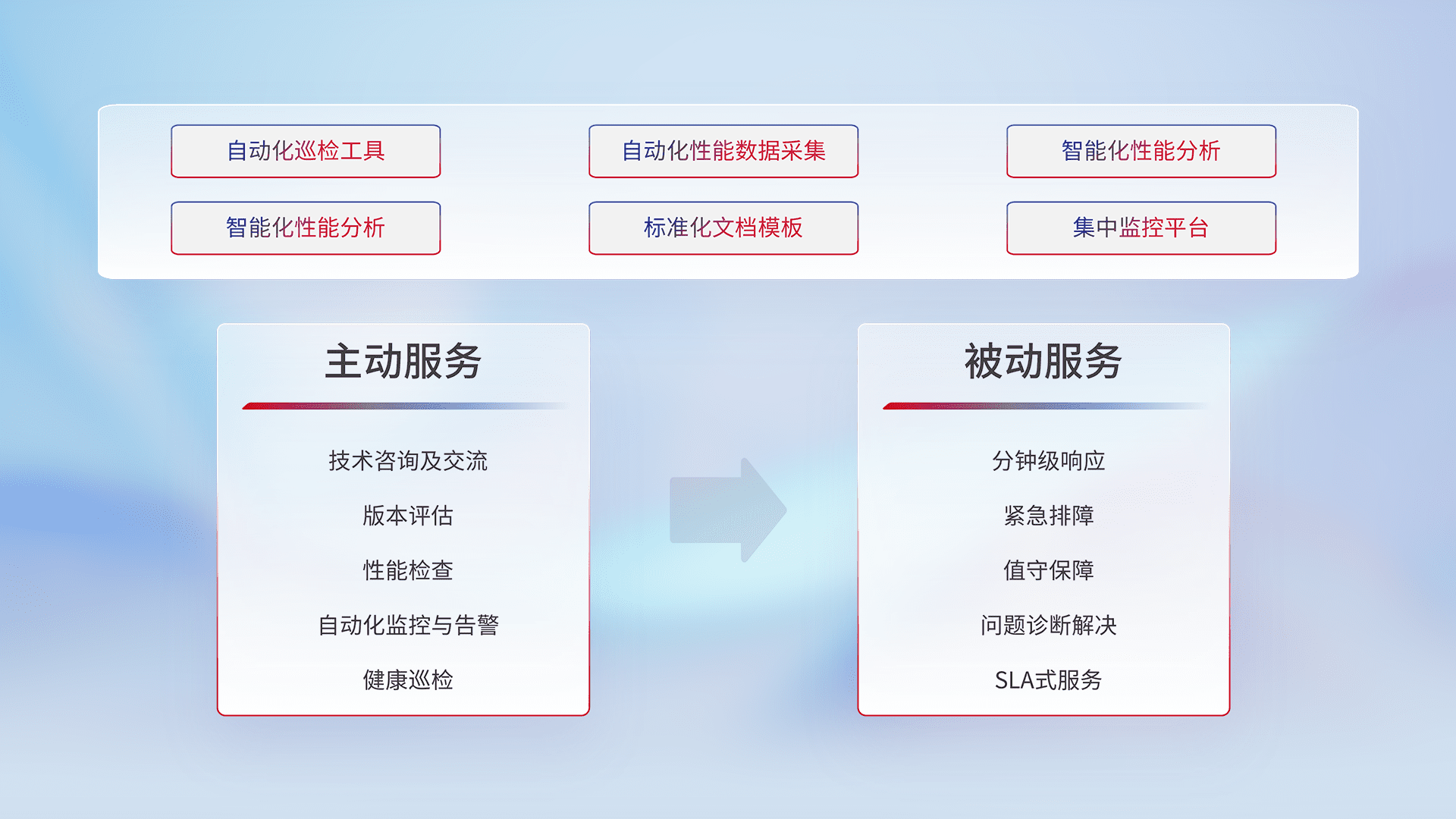 智能化工具和标准化文档,,,,保障服务质量,,,提供主动服务(包含技术咨询、、、版本评估、、、、性能检查、、自动化监控与告警、、、、健康巡检)和被动服务包含(分钟级响应、、、、紧急排障、、、、值守保障、、、问题诊断解决、、SLA服务)。。。。